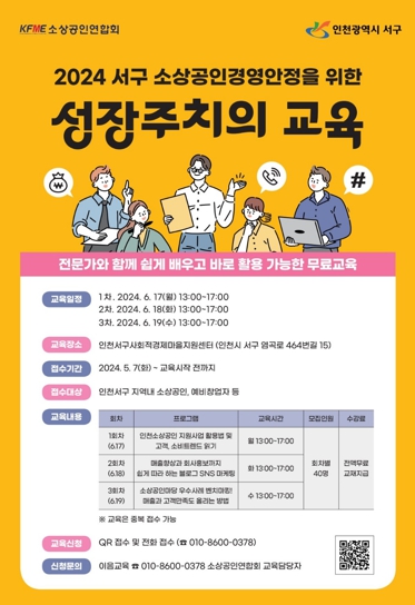 올해 교육프로그램 주제는 ▲인천 소상공인 지원사업 활용법 및 고객, 소비트렌드 읽기(6월 17일) ▲매출 향상과 회사홍보까지 쉽게 따라하는 블로그 SNS 마케팅(6월 18일) ▲소상공인마당 우수사례 벤치마킹! 매출과 고객만족도 올리는 방법(6월 19일)이다.
