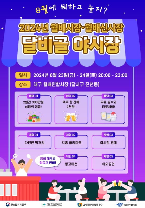 [뉴스서치] 달서구에서 최초로 개최되는 2024 월배·월배신시장 야시장은 23일(금)~24일(토) 오후 8시부터 11시까지 이틀간 진행된다. 행사는 여름밤의 낭만을 더해 줄 버스킹 공연 및 팝업스토어 운영, 체험행사, 빙고미션을 통한 경품이벤트 등 고객들에게 다양한 먹거리, 즐길거리, 볼거리를 제공할 예정이다.