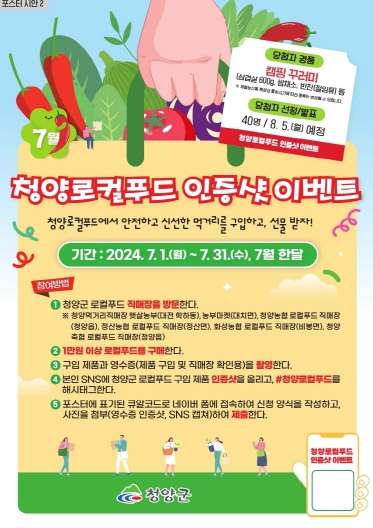 이번 행사는 청양군 지역 먹거리(로컬푸드) 직매장 활성화를 위해 청양먹거리직매장을 방문해 1만 원 이상 지역 먹거리를 구매하고 구입 제품과 영수증 사진을 찍어 인증하면 추첨을 통해 청양산 먹거리로 구성된 캠핑용 꾸러미(3만 원 상당)를 제공하는 행사다.