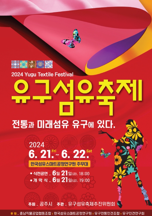 ‘전통과 미래섬유 유구에 있다’라는 주제로 열리는 이번 축제는 6월 21일과 22일 양일간 유구읍 한국섬유스마트공정연구원 주무대(유구읍 유구외곽로 236-6 일원)에서 개최된다.