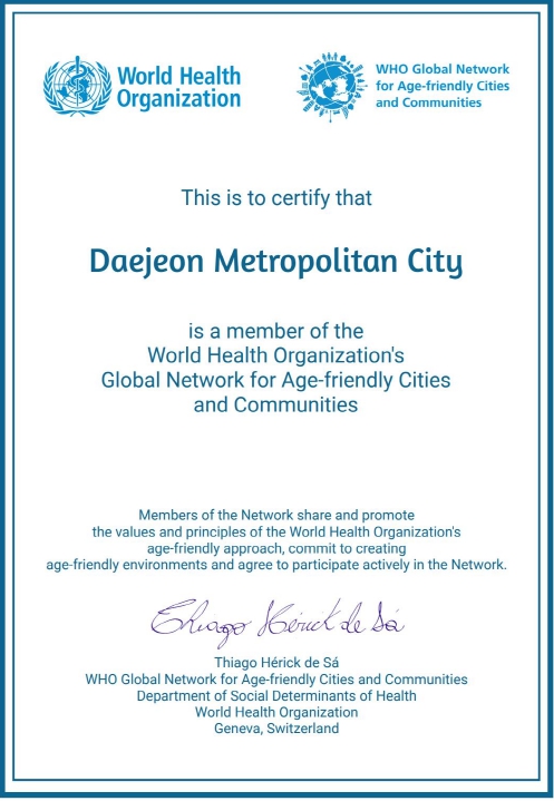 [뉴스서치] 대전시는 세계보건기구(WHO)로부터 고령친화도시 국제네트워크(Global Network of Age-Friendly Cities & Communities, GNAFCC) 가입을 인증받았다.