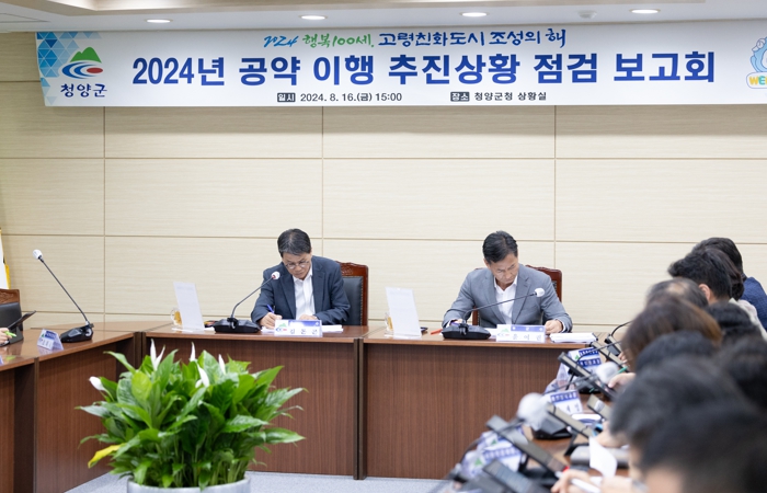 [뉴스서치] 청양군은 지난 16일 군청 상황실에서 민선8기 2024년 공약 이행 추진상황 점검 보고회를 열고 100% 완료 의지를 다졌다.