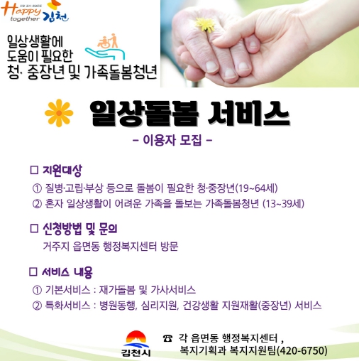 [뉴스서치] 김천시는 돌봄이 필요한 청・중장년과 가족 돌봄 청년의 일상생활의 어려움을 해소하기 위해 오는 4월부터 일상 돌봄 서비스 사업을 시행한다고 밝혔다.