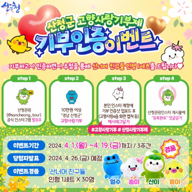 행사는 산청군에 고향사랑기부금 10만원 이상 기부하고 인스타그램에 인증한 30명을 추첨해 경품을 지급한다.
