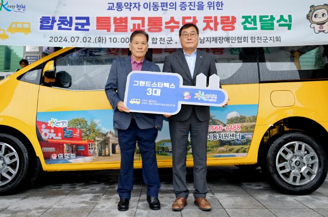 [뉴스서치] 합천군은 지난 2일 합천군청 광장에서 휠체어 탑승 장비를 갖춘 특별교통수단 및 휠체어택시 3대를 위탁운영기관인 (사)경남지체장애인 합천군지회에 전달했다.