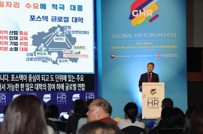 ▲ 이강덕 포항시장이 지난해 11월 개최된 ‘글로벌 인재 포럼 2023’에 참석해 지역과 대학의 상생으로 지방소멸 위기를 극복하는 방안에 대한 의견을 제시하고 있다. |