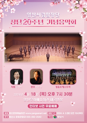 나동연 양산시장은 “창단 20주년을 맞이한 양산시립합창단이 지난 20년을 그래왔듯이 앞으로도 삶에 지친 시민의 마음을 위로하고 희망찬 내일을 노래하길 바란다”며 “이번 공연은 양산시립합창단의 최고 기량을 만날 수 있는 무대일 것”이라며 양산시민들의 많은 관람을 당부했다.