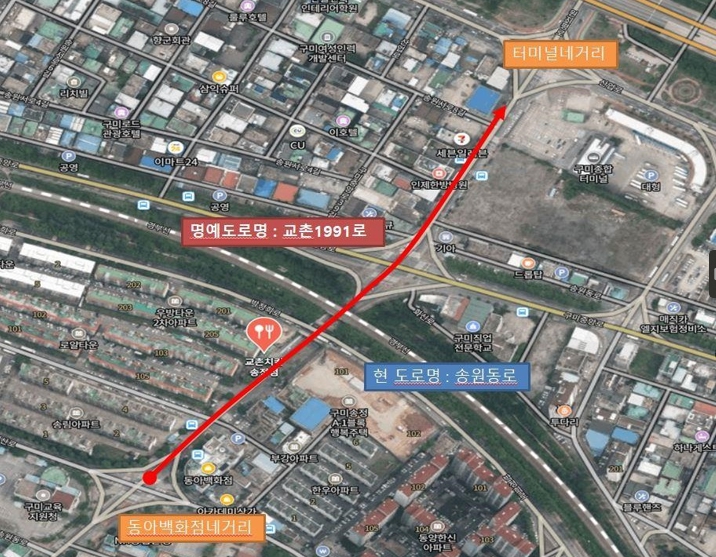 법정도로명인 송원동로의 일부 구간으로 동아백화점에서 구미버스터미널까지 약 500미터 구간이며, 사용기간은 5년으로 주소정보위원회 재심의를 통해 연장할 수 있다.