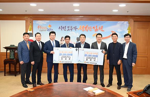 문연시 부회장((주)지석엔지니어링 대표)과 민경준 부회장((주)정민실업 대표)이 지난 16일 김천시청을 방문해 고향사랑기부금 1,000만 원(각 500만 원)을 전달했다.
