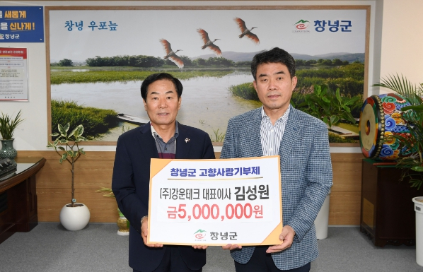 [뉴스서치] 창녕군은 지난 26일, 창원시에 거주하는 ㈜강운테크 김성원 대표가 창녕군에 고향사랑기부금 개인 최고액인 500만 원을 기탁했다고 밝혔다.