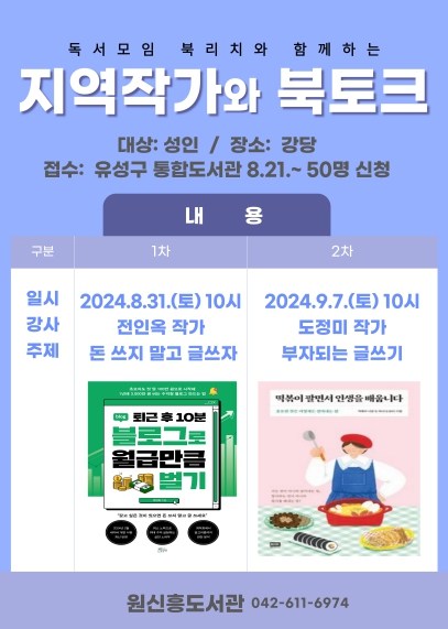 강연 과정은 (8.31.) 전인옥 작가와‘돈 쓰지 말고 글쓰자’를 주제로, 저서'퇴근 후 10분 블로그로 월급만큼 벌기', (9.7.) 도정미 작가와‘부자되는 글쓰기’를 주제로, 저서'떡볶이 팔면서 인생을 배웁니다'에 대해 강연하고 이야기를 나누는 형식으로 진행될 예정이다.