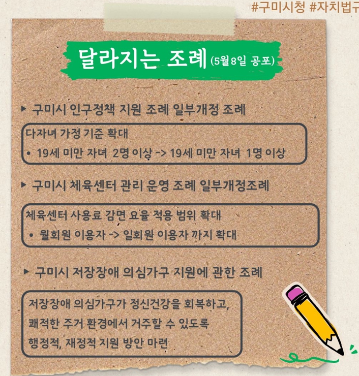 김장호 구미시장은 “시민들이 제·개정되는 자치법규에 따른 혜택을 빠짐없이 누릴 수 있도록 SNS 게시 등 다양한 방법으로 대시민 홍보를 확대하겠다”고 했다.