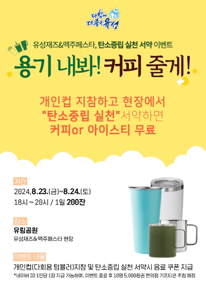 정용래 유성구청장은 “1회용품 줄이기는 기후변화 대응과 탄소중립 달성을 위한 필수 과제”라며 “텀블러를 지참해 음료와 함께 축제를 즐기고, 탄소중립 실천에도 동참해 주시기 바란다”라고 말했다.