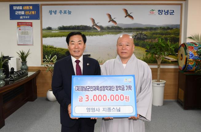 [뉴스서치] 창녕군은 영산면에 있는 영명사에서 지난 20일, 지역의 인재 육성을 위해 써달라며 (재)창녕군인재육성장학재단에 장학금 3백만 원을 기탁했다고 밝혔다.