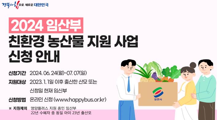 [뉴스서치] 영천시가 오는 24일부터 7월 7일까지 관내 임산부를 대상으로 2024년 임산부 친환경농산물 지원 사업을 신청받는다고 18일 밝혔다.