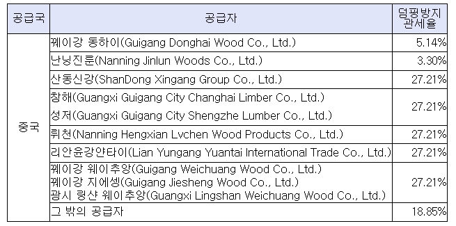 ▲ 공급자별 덤핑방지관세 부과율(중국산 합판 반덤핑조사(3차재심) ) |
