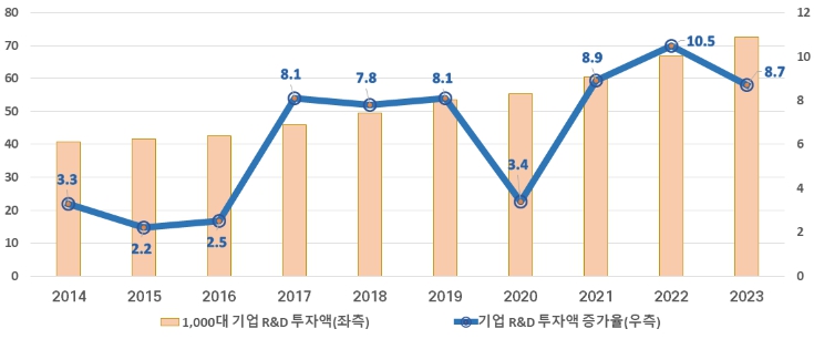 [뉴스서치] 산업통상자원부와 한국산업기술진흥원(원장 민병주)은 2023년 국내 R&D 투자 상위 1,000대 기업*의 R&D 투자 조사 결과를 발표했다.