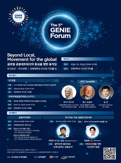 [뉴스서치] 전북특별자치도는 10월 23일부터 24일까지 전북대학교 진수당 일원에서 '글로벌 금융 네트워크 중심을 향한 움직임'을 주제로 제5회 지니포럼(GENIE Forum)을 개최한다고 밝혔다.
