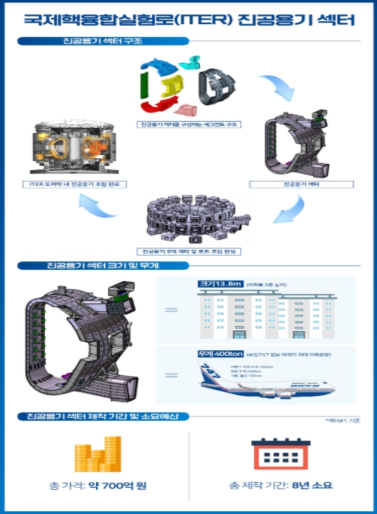 국제핵융합실험로 진공용기는 초고온 플라즈마를 발생·유지하기 위한 고진공 환경을 구현하는 핵융합로의 핵심 설비이다. 총 9개의 부문(섹터)으로 구성되어 있으며 우리나라는 4개 부문 제작을 담당한다. 각각의 부문(섹터)은 높이 13.8m, 무게 약 400톤으로 9개 부문(섹터)을 모두 조립 시, 무게가 5천 톤에 달하는 초대형 구조물이다.