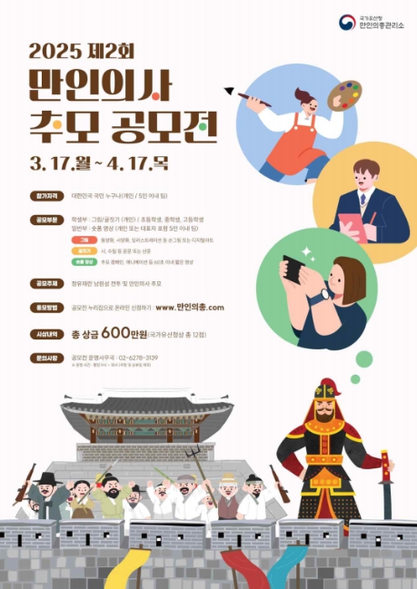 [뉴스서치] 국가유산청 만인의총관리소는 4월 17일까지 ‘정유재란 남원성 전투와 만인의사 추모’를 주제로 '2025 제2회 만인의사 추모 공모전'을 개최한다.