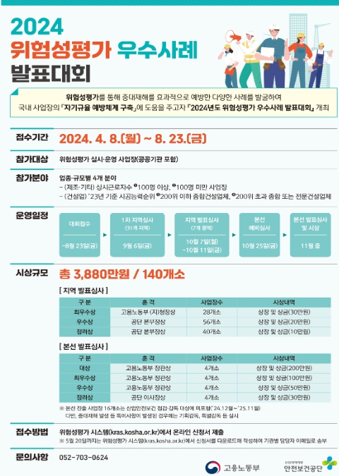 [뉴스서치] 고용노동부와 안전보건공단(이사장 안종주)은 오는 8일부터 8월 23일까지 위험성평가 우수사례를 공모한다. 위험성평가란 노사가 함께 사업장의 유해위험요인을 찾고 개선하는 과정으로 가장 효과적인 산재예방 활동이다. 우수사례를 제출한 기업은 10월 지역 예선을 거쳐 11월 본선인 「위험성평가 우수사례 발표대회」에 출전하게 된다.