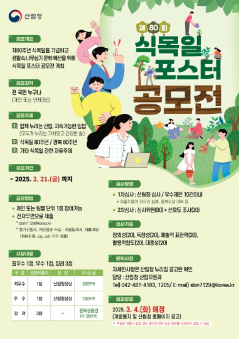 공모 분야는 포스터 디자인으로, ‘모두가 누리는 가치있고 건강한 숲’을주제로 80주년을 맞이한 식목일의 의미와 숲의 소중함을 창의적으로 표현한 작품을 모집한다.