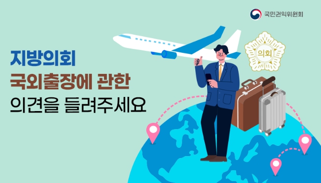 [뉴스서치] 국민권익위원회는 지방의회 의원의 국외출장 개선방향에 관하여 설문조사 방식으로 국민 의견을 수렴한다.