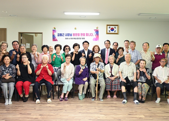 ▲ 김동근 시장이 ‘돌봄 삶의 현장’의 일환으로 의정부1동 소재 경로당을 방문해 노인들과 함께 기념사진을 찍고 있다. |