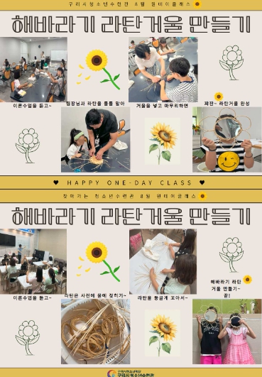 [뉴스서치] 구리시청소년재단 청소년수련관은 환경 보호와 창의적인 예술 활동으로, 지난 8월 6일 빛소어린이작은도서관과 8월 7일 수련관 3층 멀티룸에서 ‘해바라기 라탄거울 만들기’ 프로그램을 운영했다.