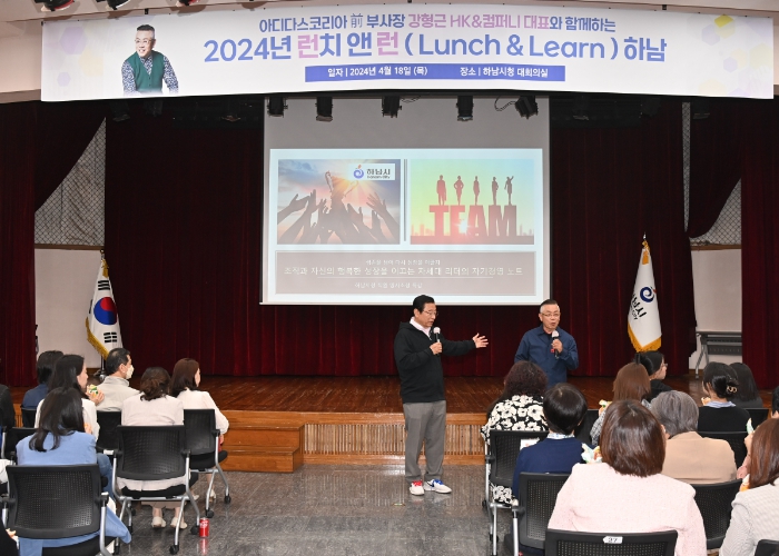 하남시는 18일 시청 본관 대회의실에서 공직자 150여명이 모인 가운데 진행된 ‘2024년 런치앤런’(Lunch&Learn) 특강에 강형근 대표를 초빙해 ‘조직과 자신의 행복한 성장을 이끄는 차세대 리더의 자기경영 노트’를 주제로 한 명사초청 특강을 진행했다.