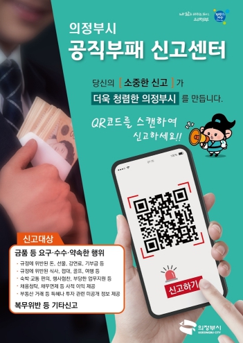 이에 시는 부패행위 일소를 위한 칼을 빼들었다. ‘금품 등 요구‧수수‧약속’에 해당하는 부패행위를 신고할 수 있도록 ‘정보 무늬(QR코드) 신고 안내문’을 제작, 전 부서에 배포해 사무실에 부착하도록 했다. 신고 안내문에는 신고대상 부패행위 5가지를 구체적으로 명시하고, 민원인‧직원 누구든 부패행위를 목격하면 간단하게 스마트폰으로 스캔‧신고할 수 있게 해 극소수 부패행위자가 일말의 부패의지도 갖지 못하도록 근무환경을 구축했다.