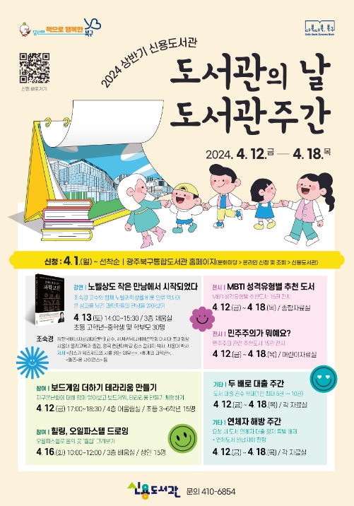 먼저 중흥도서관에서는 ‘신민재 작가와의 만남’, ‘우리는 책과 함께하는 가족’ 등 10 프로그램이 진행되고 일곡도서관에는 ‘한얼 작가와의 만남’, ‘나만의 북커버 만들기’ 등 7개 프로그램이 주민들에게 제공된다.