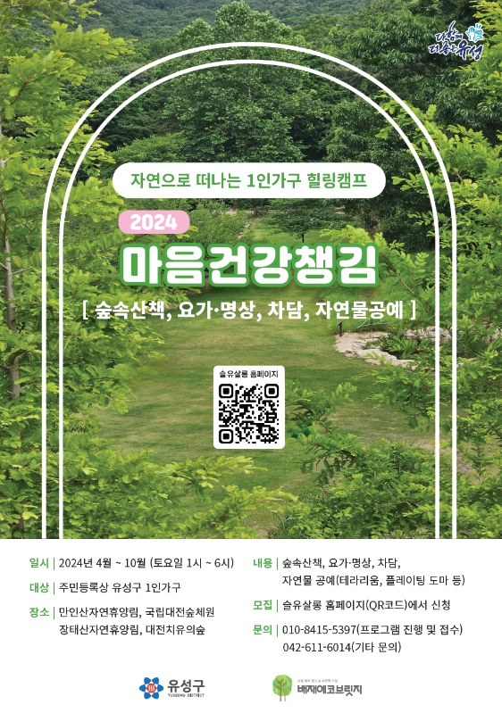 [뉴스서치] 대전 유성구가 4월부터 10월까지 1인가구 숲속 힐링캠프 '마음건강챙김'사업을 추진한다.