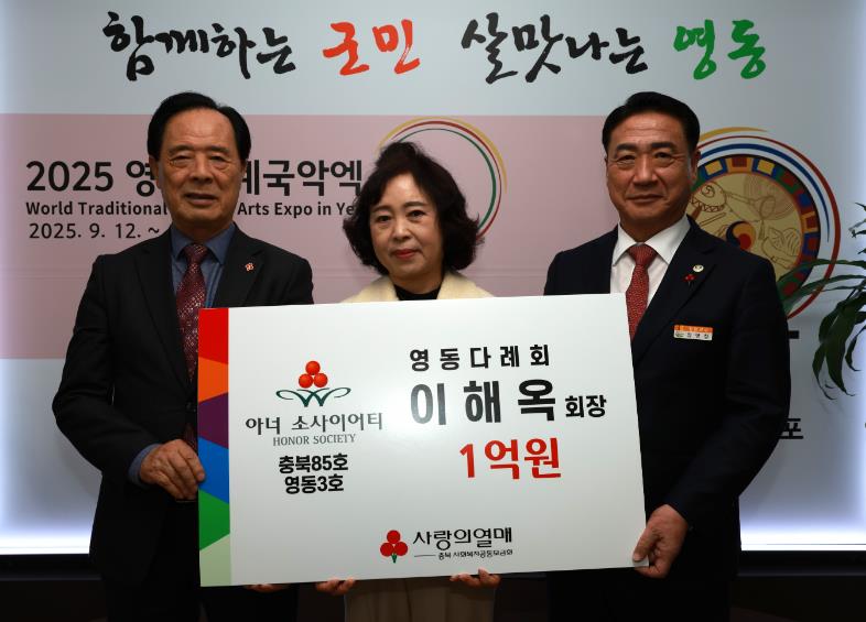 이해옥 회장은 이날 영동군 제3호 아너소사이어티 회원이 되며, 정영철 영동군수로부터 인증패를 전수받았다.