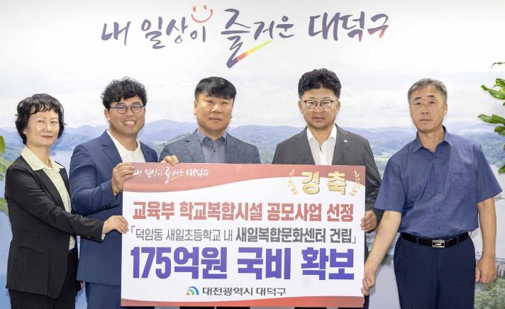 대덕구는 사업추진을 위해 지난 7월 대전시교육청·대전동부교육지원청·새일초등학교와 업무협약을 체결하고 교육부에 학교복합시설 공모를 신청했으며, 이번 사업 선정으로 학교복합시설 전체 사업비 250억원 가운데 총 175억원의 예산을 지원받게 됐다.