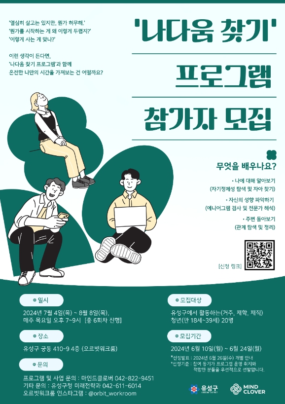 참여신청은 유성구에 거주, 재학, 재직 중인 청년(18세~39세)으로 6월 24일까지 큐알코드 신청 링크를 통해 신청할 수 있으며, 참여동기 등을 우선적으로 고려해 대상자 20명을 선정한다.