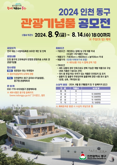 [뉴스서치] 인천 동구는 동구를 상징하는 특색있고 차별화된 관광기념품을 발굴·육성하고자 ‘2024 인천 동구 관광기념품 공모전’을 개최한다고 밝혔다.