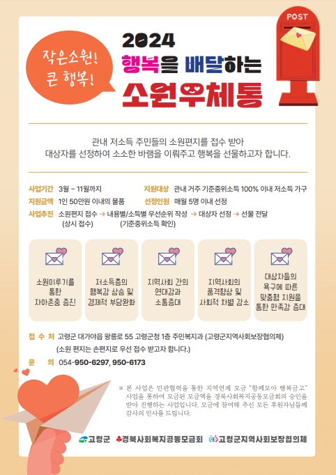 [뉴스서치] 고령군지역사회보장협의체는 함께모아 행복금고 지원사업으로 2024년 4월부터 11월까지 지역 내 저소득가정의 일상적인 소소한 소원을 이루어주는 “작은소원, 큰행복!” '소원우체통' 지역 특화사업을 시작한다.