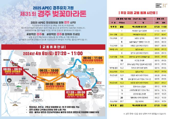▲ 제31회 경주벚꽃마라톤 주요 구간 교통통제 시간표 |