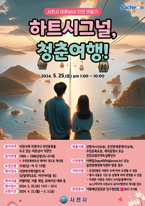 24일 시에 따르면 5월 25일 사천 남일대리조트에서 청춘남녀 만남의 장인 ‘사천시 미혼남녀 인연 만들기’ 행사가 개최된다.