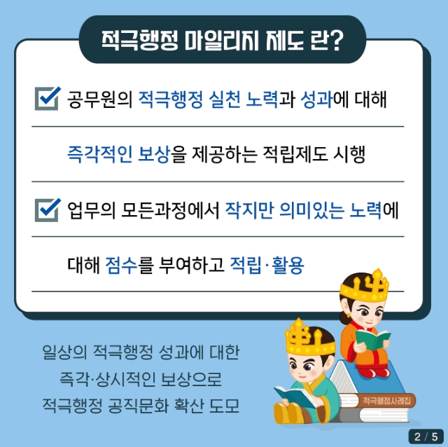 적극행정 마일리지 제도는 적극행정 활동을 한 공직자에게 마일리지를 부여하고 적립한 점수에 따라 보상하는 내용이다.