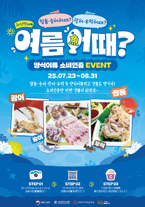 [뉴스서치] 해양수산부는 여름철 양식수산물 소비 활성화를 위해 7월 23일부터 8월 31일까지 한국수산회·한국외식업중앙회·수협중앙회와 함께 '어식백세-여름어(魚)때?' 캠페인을 실시한다고 밝혔다.