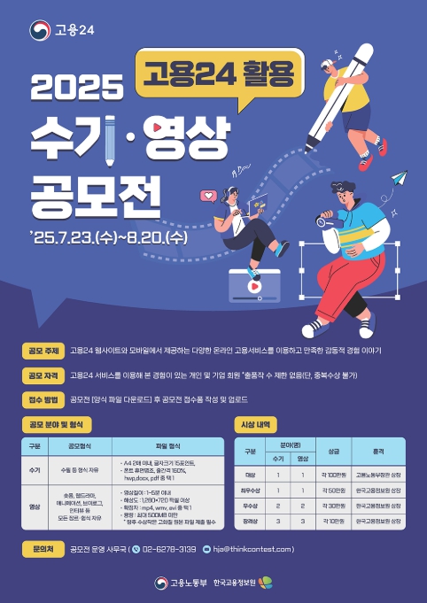 공모 분야는 ‘고용24’ 이용 경험을 담은 수기와 영상 2개 부문이다. 인공지능(AI) 잡케어, 일자리 추천 서비스 등을 이용해 취업에 성공한 사례, 인공지능이 추천한 인재를 채용한 사례, 고용24에서 육아휴직급여·국민내일배움카드·실업급여·고용허가제 등을 신청한 경험 등 디지털 고용서비스를 이용해 본 경험이 있는 개인·기업이라면 누구나 참여할 수 있다. 공모전에 대한 상세한 내용은 고용24 누리집에서 확인할 수 있다.