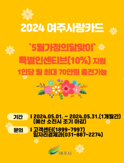 [뉴스서치] 여주시는 5월 가정의 달을 맞이하여 지역화폐 ‘여주사랑카드’인센티브를 상시 인센티브 6%에서 특별 인센티브 10%로 확대 지원한다고 밝혔다.