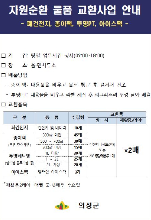 ▲ 의성군, 교환물품 2배로 받는 ‘재활용2데이’ 운영 |