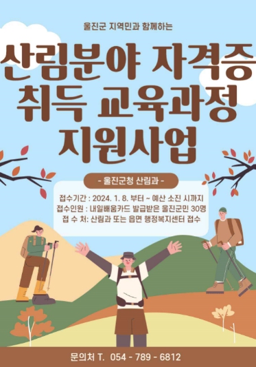 산림분야 자격증 취득 교육과정 지원사업은 산림청 또는 고용노동부로부터 인증받은 산림분야 자격증을 대상으로 교육비를 지원하며, 배움카드를 발급받은 19세 이상 울진군민 누구나 신청할 수 있다.
