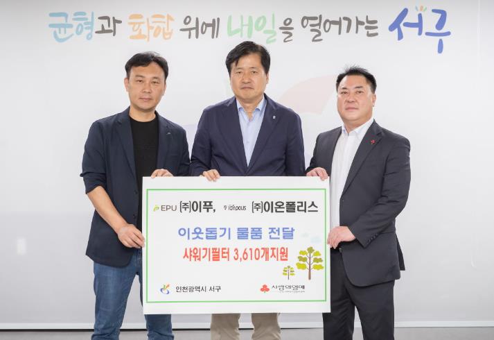 [뉴스서치] 인천 서구는 8월 13일 ㈜이푸(대표이사 김재준), ㈜이온폴리스로부터 이웃사랑 물품(샤워기필터) 3,610개를 기탁받았다.