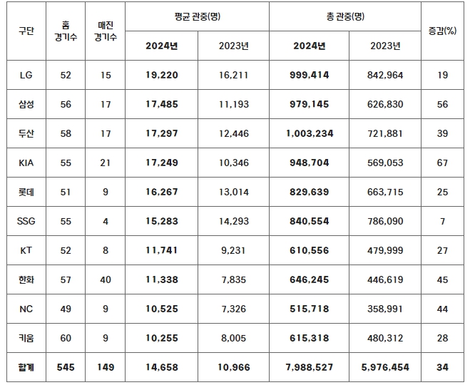 또한 10개 구단 모두 지난해 홈 동일 경기 수 대비 관중이 증가한 모습을 보여주고 있다. KIA가 67% 증가하며 가장 높은 증가 수치를 보였고, 삼성 56%, 한화 45%, NC 44%, 두산 39% 등 전체 총 관중은 지난 시즌 대비 34% 증가했다.