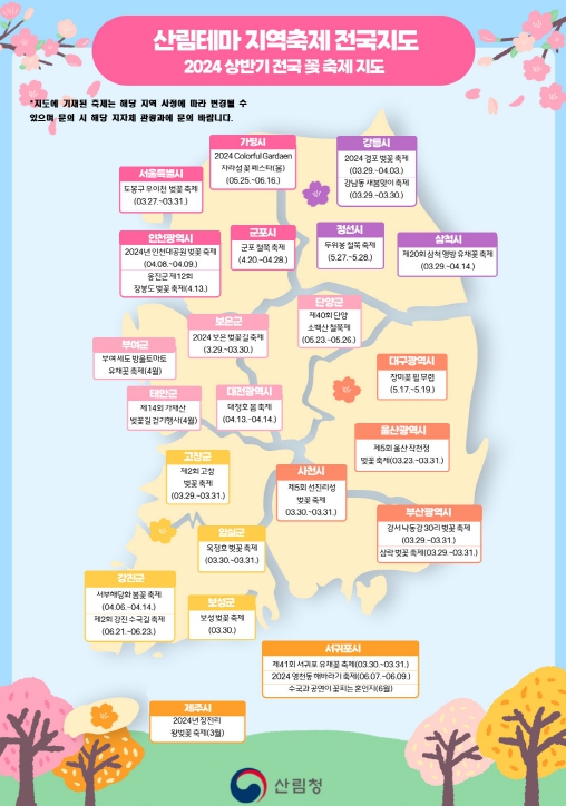 산림청은 본격적인 지역축제 개최에 앞서 ‘산림테마 지역축제 전국지도’를 제작해 올해 상반기 동안 산림과 관련된 지역축제 정보를 제공한다. 대표적으로 3~4월에는 대전 대청호 봄축제와 서귀포 유채꽃 축제, 5∼6월에는 담양 대나무 축제와 영양 산나물 축제 등이 예정되어 있다.