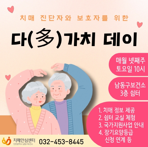 [뉴스서치] 인천시 남동구 치매안심센터는 치매 신규환자 및 보호자를 위한 치매안심센터 만남의 날 ‘다(多)가치데이’를 운영한다고 28일 밝혔다.